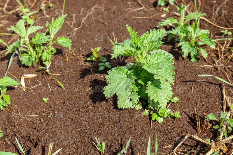 Весной на земле растет молодой зеленый куст обыкновенной крапивы. крапива двудомная