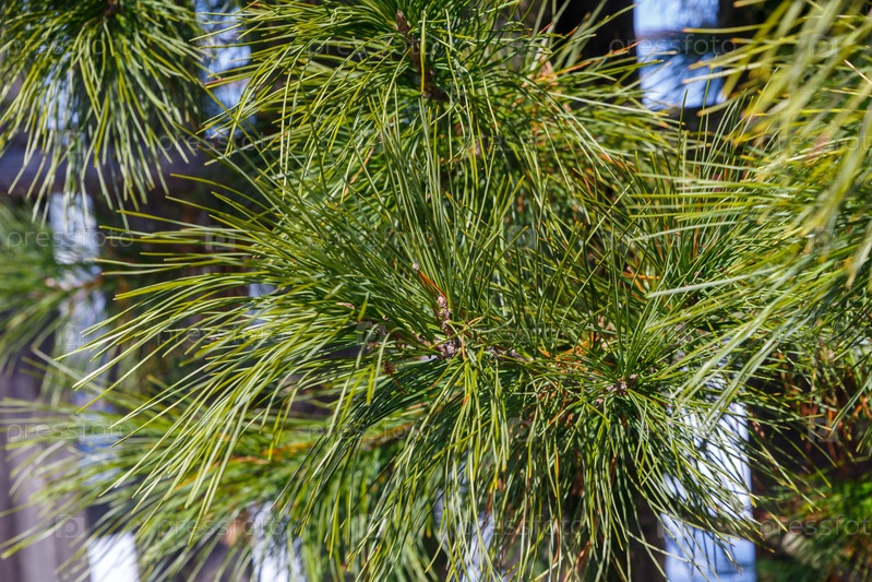 Сибирская сосна или Pinus sibirica, ветви с длинными зелеными пушистыми иглами возле деревянного забора