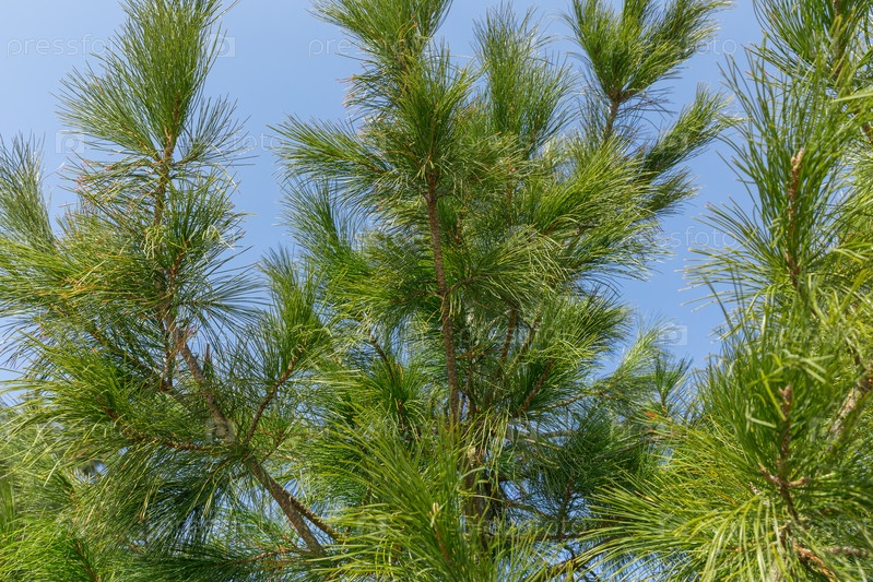 Сибирская сосна или Pinus sibirica, ветви с длинными зелеными пушистыми иглами на фоне голубого неба