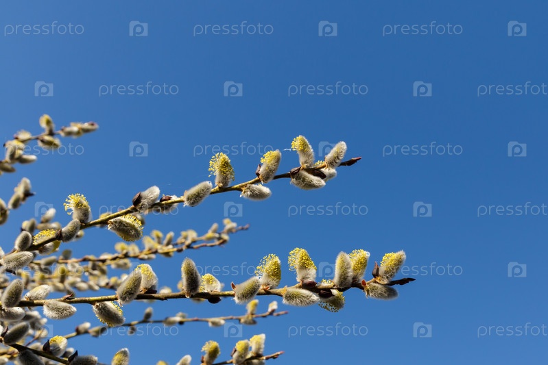 Ивовые почки ранней весной и голубое небо. Цветущие веточки ивы и пушистые сережки