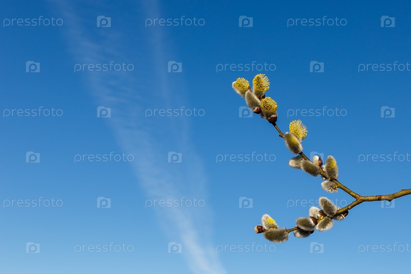 Цветы ивы на фоне голубого неба. Цветущие веточки ивы и пушистые сережки