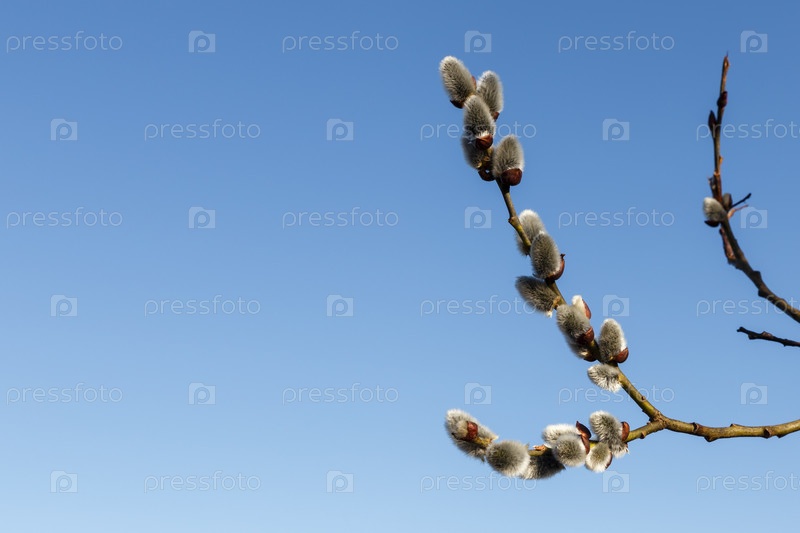Ивовые почки ранней весной и голубое небо. Цветущие веточки ивы и пушистые сережки