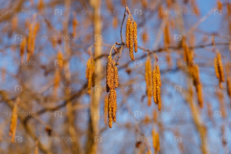 Ольха обыкновенная. мужское соцветие на фоне голубого неба. Ветка ольхи ранней весной