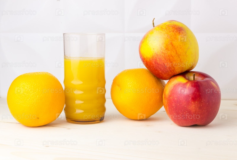 Свежий фруктовый сок яблоко и апельсин на светлом фоне