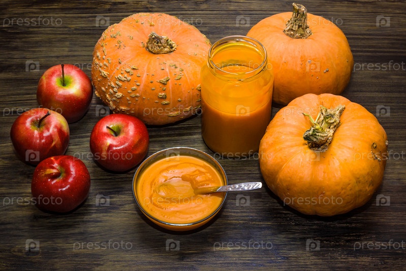 Тыквы и яблоки. Осенний урожай фруктов и овощей. Пюре из тыквы и яблок