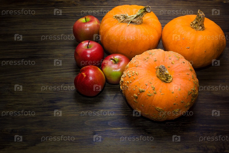 Тыквы и яблоки. Осенний урожай яблок и тыкв на деревянном столе. Красные яблоки