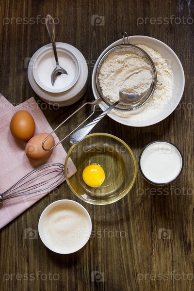 Готовим тесто для блинов на кефире. Яйца, просеянная мука, стакан кефира, сахар, соль. Рецепт. Деревянный стол. Деревенский стиль. Деревенский. Макет фона