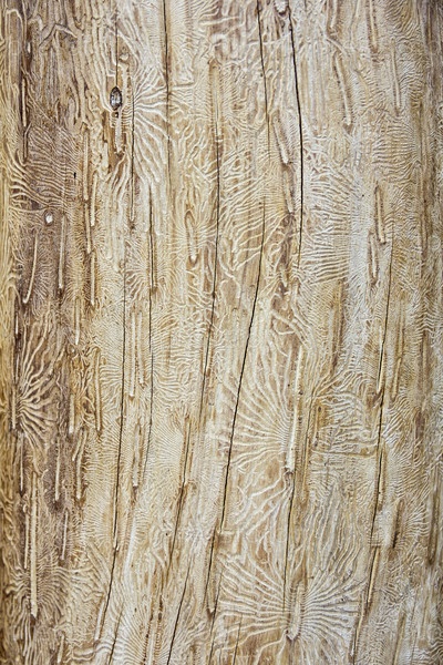 Старый ствол дерева без коры, прогрызенный древесными червями со следами червей, фон