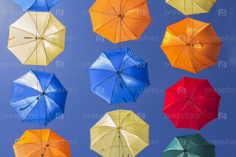 Раскрытые разноцветные зонтики с парящей в воздухе частью голубого неба