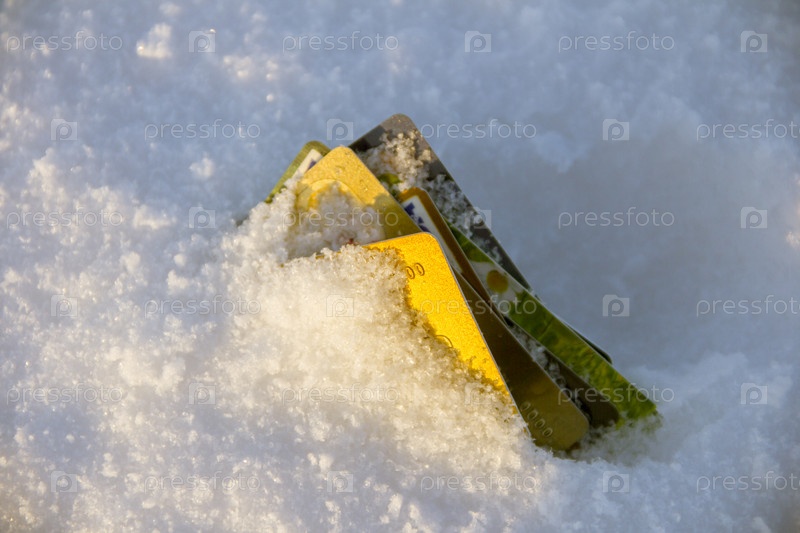 Фото концепции замороженного банковского счета. Кредитные карты засыпаны снегом