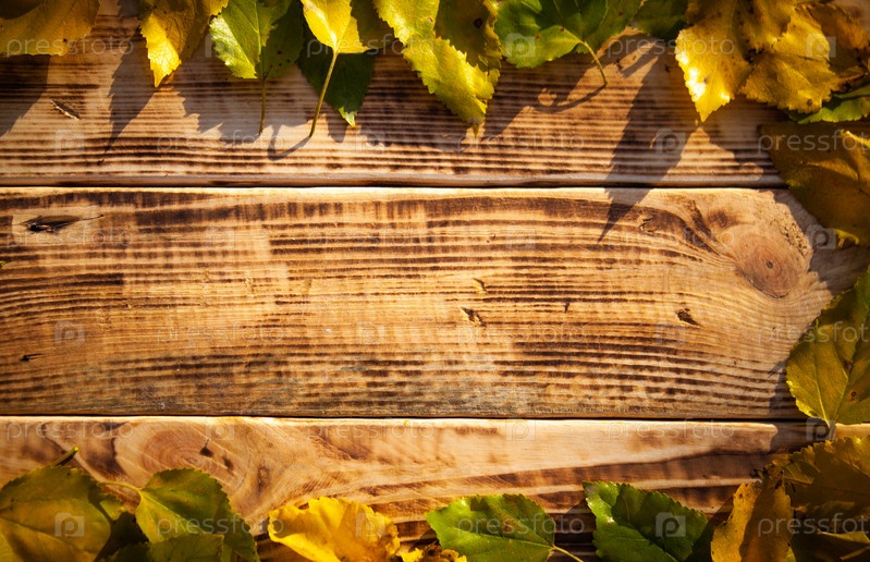 Осенние листья на фоне сгоревших деревянных. Текстура желтых и красных листьев на коричневом дереве вид сверху с копировальным пространством