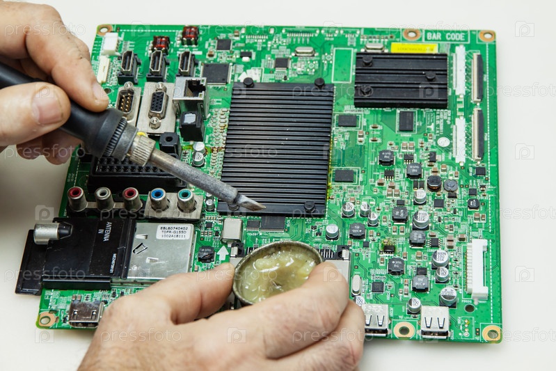 Мужские руки с паяльником ремонтируют материнскую плату телевизора