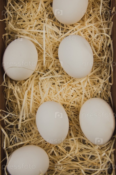 Шесть белых куриных яиц лежат в деревянном ящике в соломе