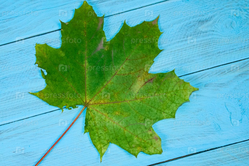 Зеленый кленовый лист на синем фоне дерева