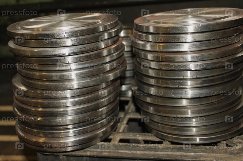 Две стопки металлических блинов находятся на производственном складе