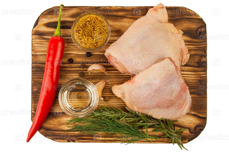 Сырые куриные бедра с зеленью, чесноком, горчицей, кайенским перцем и маслом на деревенской деревянной доске, изолированной на белом фоне