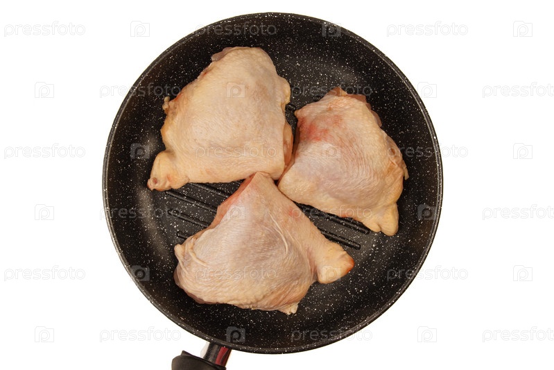 Сырые куриные бедра, лежащие на сковороде-гриль, изолированные на белом фоне