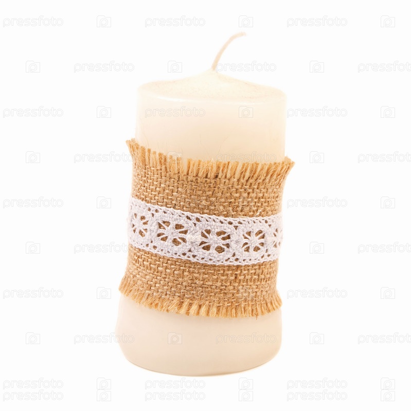 Большая белая свеча, украшенная узором из шпагата, изолированная на белом фоне