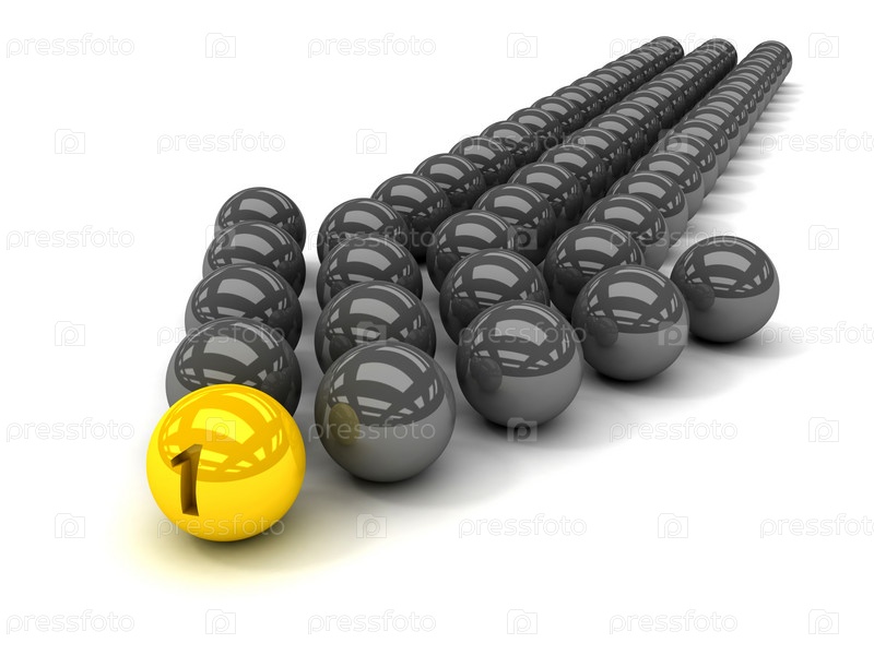 Стрелка из серых сфер с золотым лидером впереди Концептуальная 3D-иллюстрация