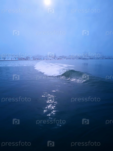 Одна волна закручивается по поверхности моря. Брызги волны на Черном море вечером