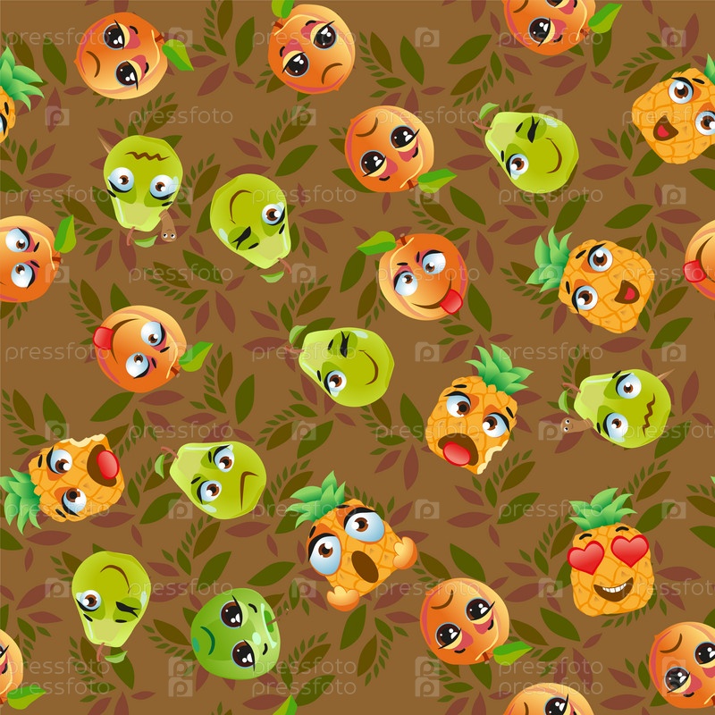 Бесшовный рисунок экзотических фруктов питахайя, груша, ананас, абрикос, яблоко, фрукты вишневый красный Смешные милые лица персонажа