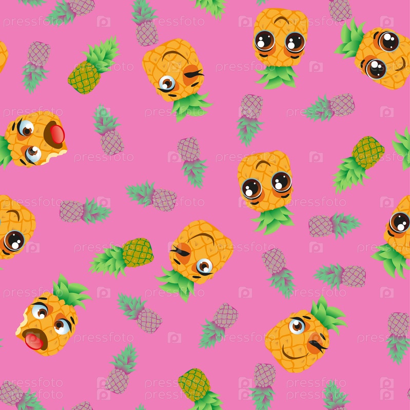 Бесшовный узор из экзотических фруктов ананаса. Смешные милые лица персонажей