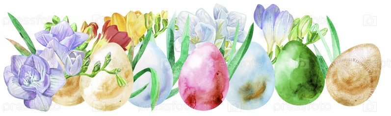 Акварельные пасхальные яйца с фрезией и зеленой травой на белом фоне. Элемент дизайна для поздравительных открыток, открыток и приглашений