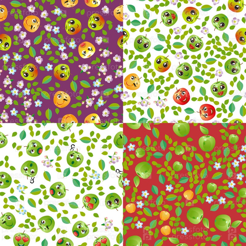 Набор бесшовных фруктовых яблок. Смешные милые лица персонажей