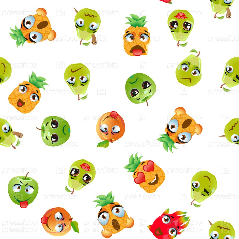 Бесшовный рисунок экзотических фруктов питахайя, груша, ананас, абрикос, яблоко, фрукты вишневый красный Смешные милые лица персонажа