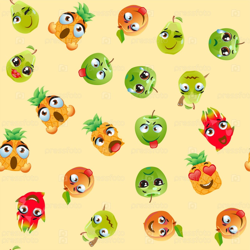 Бесшовный рисунок экзотических фруктов питахайя, груша, ананас, абрикос, яблоко, фрукты вишневый красный Смешные милые лица персонажа