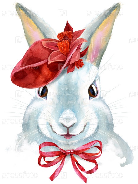 Милый белый кролик в красной шляпе на белом фоне с вкраплениями, изолированный