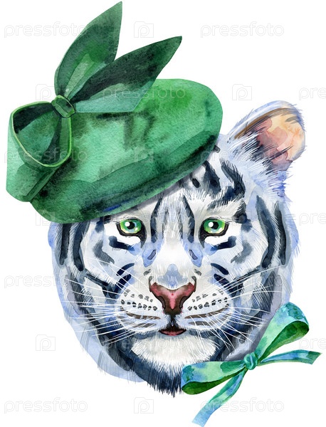 Акварельная иллюстрация белого тигра в зеленой элегантной шляпе и банте сбоку