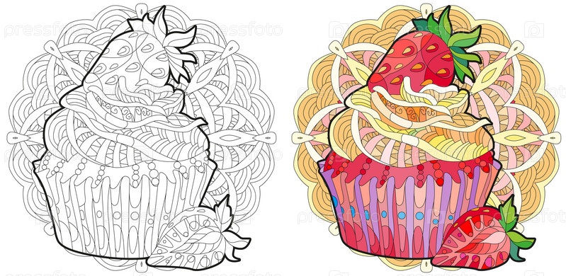 Векторный кусок торта со клубникой на узорно-круглой подложке для окраски. Ручная иллюстрация к футболку в стиле зентангл, каракули. Набор цветов и контуров