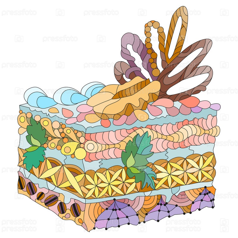 Векторный кусок пирога с абстрактными орнаментами.Ручная иллюстрация для футболки в стиле зентенгл, каракули