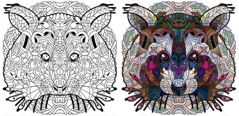 Нарисованная вручную крысиная голова на круглом орнаменте для футболки и других украшений. Набор цветов и контуров