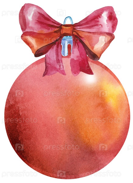 Акварель Рождественский красный шар с бантом, изолированные на белом фоне