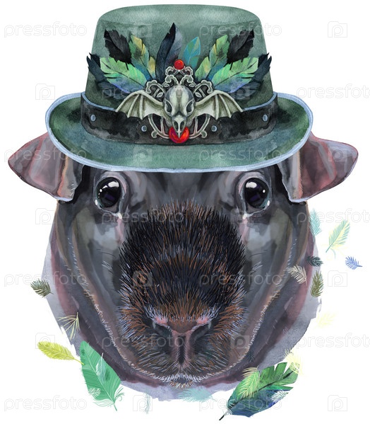 Акварельный портрет тощей морской свинки в зеленой шляпе на белом фоне