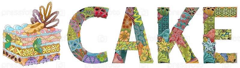 Художественный дизайн ручной росписи. Ручной рисунок слова ТОРТ с кусочком торта для футболки и других украшений