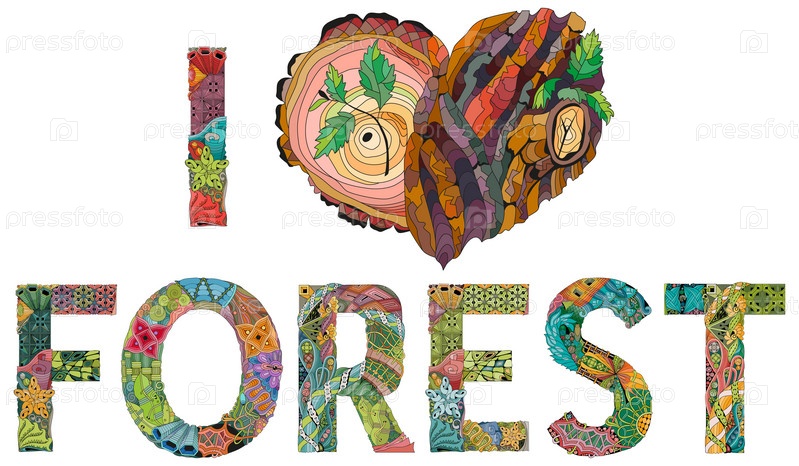Я люблю лес с сердцем с текстурой коры дерева. Художественный дизайн ручной росписи. Антистрессовая раскраска для взрослых