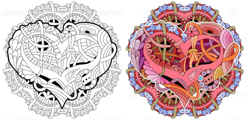 Эскизная иллюстрация сердца Doodle с мандалой. Для окрашивания. Набор цветов и контуров