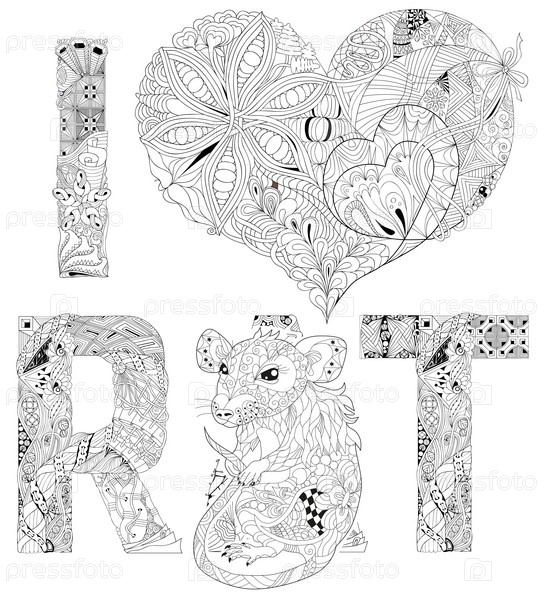 Я люблю крысу с рисунком крысы. Векторная иллюстрация ручной работы для раскраски