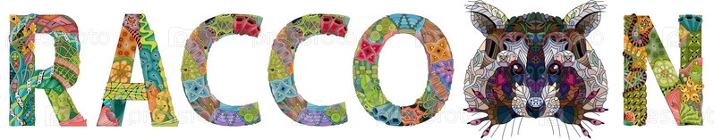 Zentangle стилизованное слово енот. Ручно нарисованная образцовая векторная иллюстрация на белом фоне. Эскиз для окрашивания для взрослых, плакаты, татуировки
