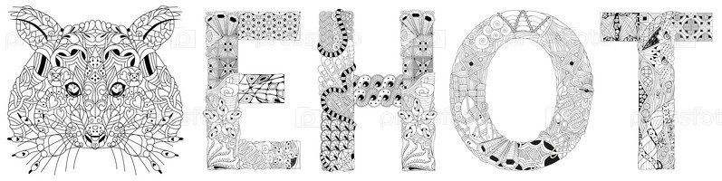 Zentangle стилизованное слово енот на русском языке. Ручно нарисованная образцовая векторная иллюстрация на белом фоне. Эскиз для окрашивания для взрослых, плакаты, татуировки