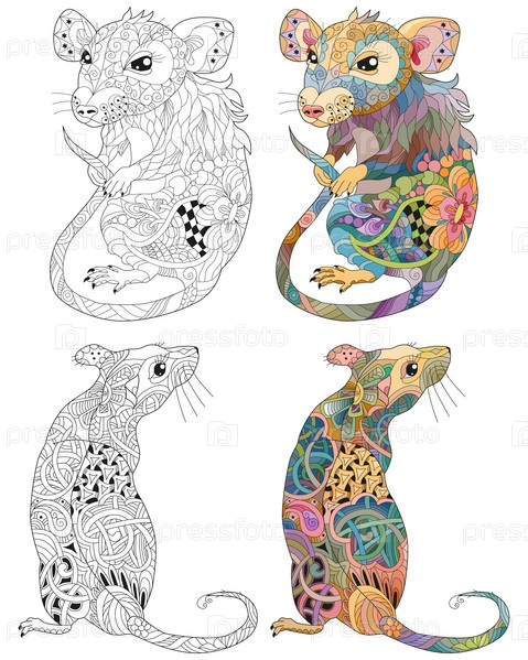 Нарисованные вручную зентангл-крысы для футболки и других украшений. Набор цветов и контуров