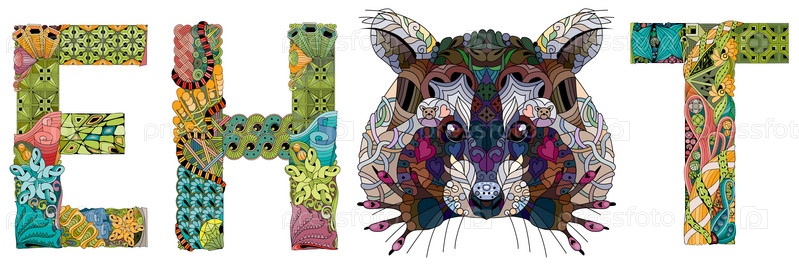 Zentangle стилизованное слово енот на русском языке. Ручно нарисованная образцовая векторная иллюстрация на белом фоне. Эскиз для окрашивания для взрослых, плакаты, татуировки