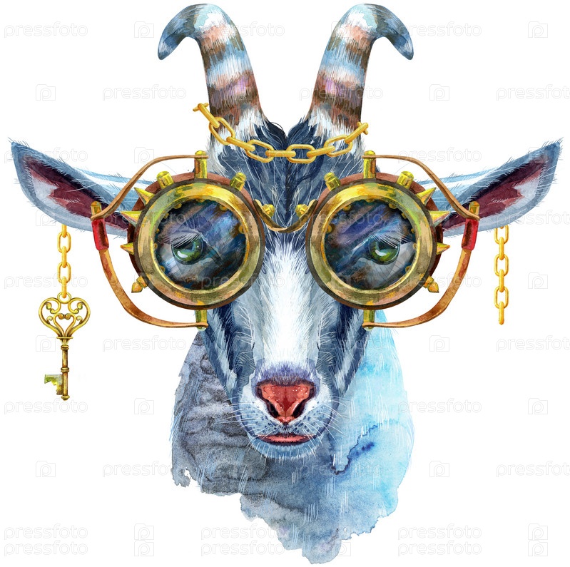 Коза в стимпанк-очках акварельная иллюстрация на белом фоне