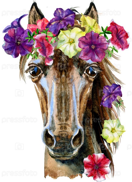 Лошадь с венком из цветов пртунии. Портрет. Акварель. Цифровое искусство. Иллюстрация. Шаблон. Клипарт