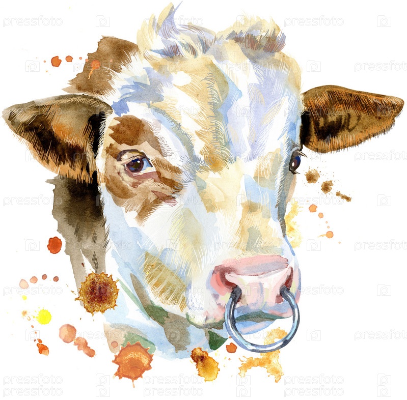 Акварельная графика быка. Иллюстрация животного быка с всплеском акварельного текстурированного фона