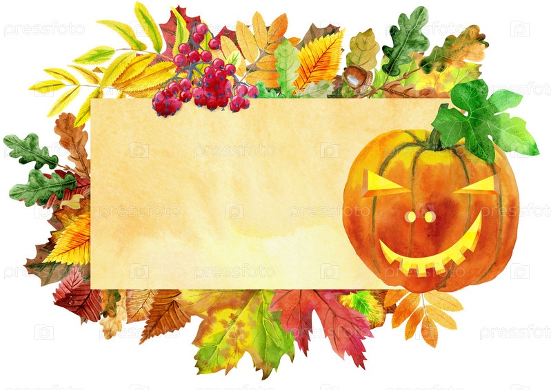 Бежевое знамя с красными, оранжевыми, коричневыми и желтыми падающими осенними листьями и тыквой