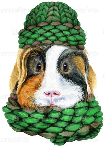 Акварельный портрет морской свинки Шелти в вязаной шапке и шарфе на белом фоне